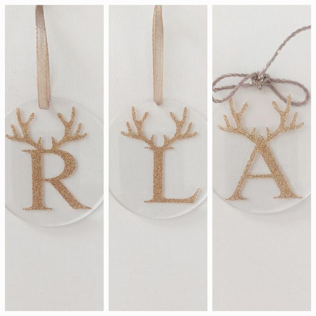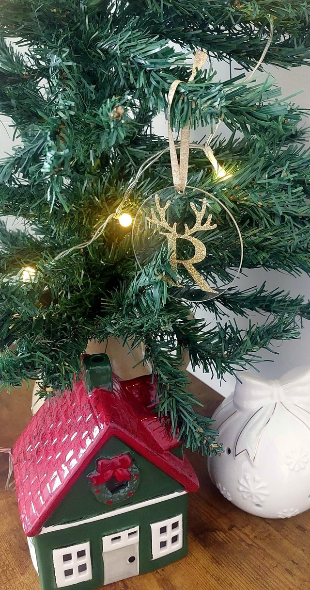 Suspension boule de Noël personnalisée plexi transparent avec lettre vinyle doré pailleté